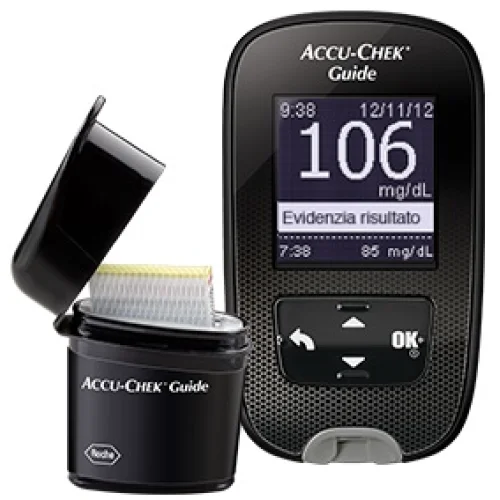 Il misuratore Accu-Chek Guide semplifica l'esecuzione del test glicemico. Dispone di un flacone anti-rovesciamento che consente la rimozione di una striscia alla volta. L'illuminazione del vano d'inserimento della striscia facilita l'esecuzione del test anche al buio, l'ampia area di applicazione del campione e il pulsante di espulsione automatica della striscia agevolano la manualità in fase di applicazione della goccia di sangue e della successiva eliminazione della striscia usata. Piccoli particolari che aiutano a superare le difficoltà quotidiane legate alla misurazione glicemica.
