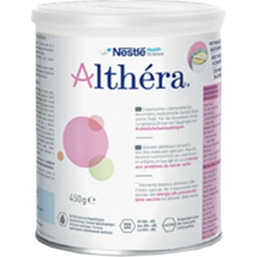 Formula ipoallergenica estensivamente idrolizzata che aiuta ad alleviare i sintomi associati all'allergia alle proteine del latte vaccino (APLV), come eczema, coliche, vomito, diarrea, stipsi e pianto. Grazie al contenuto di lattosio, da un punto di vista nutrizionale Althéra è un prodotto completo, progettato per avere una composizione simile al latte materno e alle formule standard per permettere crescita e sviluppo normali.