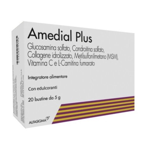 Integratore alimentare con edulcoranti. Utile in tutti i casi di ridotto apporto con la dieta o di aumento fabbisogno di glucosamina solfato, Condroitina solfato, Collagene idrolizzato, Metilsulfonilmetano (MSM), Vitamina C e L-Carnitina fumarato. La vitamina C contenuta in Amedial Plus, aiuta la regolare formazione del collagene per mantenere in buono stato le ossa, contribuendo inoltre alla formazione del collagene per il buon funzionamento delle cartilagini.