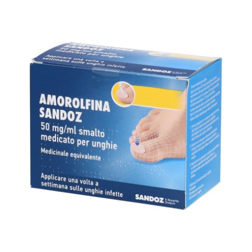 PosologiaPosologia: Lo smalto per unghie deve essere applicato sulle unghie interessate delle dita della mano o del piede una volta alla settimana. Metodo di somministrazione: Per uso topico. Da applicarsi sulle unghie interessate. 1. Prima di ogni applicazione, limare l’area dell’unghia malata (in particolare la superficie dell’unghia) il più accuratamente possibile con una limetta per unghie in dotazione nella confezione. La superficie dell’unghia deve essere pulita e sgrassata utilizzando uno dei tamponi imbevuto di solvente per smalto (in dotazione nella confezione). Prima di ripetere la successiva applicazione di Amorolfina Sandoz smalto medicato per unghie, questo processo di limatura e pulizia deve essere ripetuto, in modo da rimuovere lo smalto residuo esistente. Attenzione! Le limette per unghie utilizzate per il trattamento non devono essere utilizzate per le unghie sane .2. Con una spatola in dotazione, applicare lo smalto su tutta la superficie dell’unghia malata e lasciare asciugare. Per ogni unghia da trattare, immergere la spatola nello smalto. Attenzione! La spatola non deve essere strofinata sul bordo del flacone . Dopo l'uso, pulire la spatola con il tampone imbevuto di solvente per smalto. Dopo l’applicazione di Amorolfina Sandoz smalto medicato per unghie, deve essere rispettato un intervallo di almeno 10 minuti prima dell’applicazione di uno smalto cosmetico. È importante lavarsi le mani dopo aver applicato Amorolfina Sandoz smalto medicato per unghie. Se Amorolfina Sandoz smalto medicato per unghie è applicato sulle dita della mano, i pazienti devono aspettare che queste siano asciutte prima di lavarsi le mani. Durata del trattamento: Il trattamento deve essere continuato senza interruzioni fino a quando l'unghia si è rigenerata e la zona colpita è completamente guarita. In generale occorrono 6 mesi di terapia per le unghie delle mani e da 9 a 12 mesi per le unghie dei piedi (la durata del trattamento dipende essenzialmente dall'intensità, dalla localizzazione ed estensione dell'infezione). Dopo un trattamento di 3 mesi senza risultati, consultare il medico. Popolazione pediatrica: A causa della mancanza di esperienza clinica, bambini ed adolescenti non devono essere trattati con Amorolfina Sandoz smalto medicato per unghie. Anziani: Non vi sono raccomandazioni di dosaggio specifiche per l’uso nei pazienti anziani.