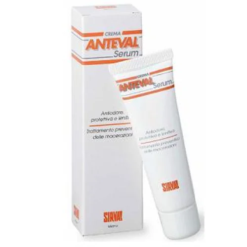 crema fluida facilmente stendibile, studiata per le zone ove il sudore stagnante, oltre a causare cattivo odore, provoca arrossamento ed irritazione della pelle. Prodotto per deodorare e proteggere le pelli sensibili e delicate che non sopportano i normali deodoranti, troppo aggressivi, ma soprattutto per coloro che, per ragioni diverse, soffrono di sudorazione eccessiva e maleodorante, come in pubertà, gravidanza, menopausa, ecc. L'effetto lenitivo del bisabololo, principio dermofunzionale attivo estratto dalla camomilla, ed un delicato antibatterico ad azione antiodore. ANTEVAL Serum forma sulla pelle una 'superficie dinamica' che svolge le seguenti funzioni: