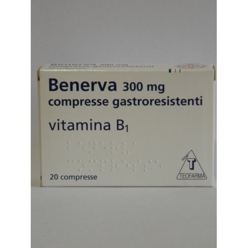 Benerva 300 mg compresse gastroresistenti. Una compressa contiene: tiamina cloridrato (vitamina B1) 300 mg. Benerva 100 mg/1 ml soluzione iniettabile per uso intramuscolare. Una fiala da 1 ml contiene: tiamina cloridrato (vitamina B1) 100 mg. Per l’elenco completo degli eccipienti, vedere 6.1.