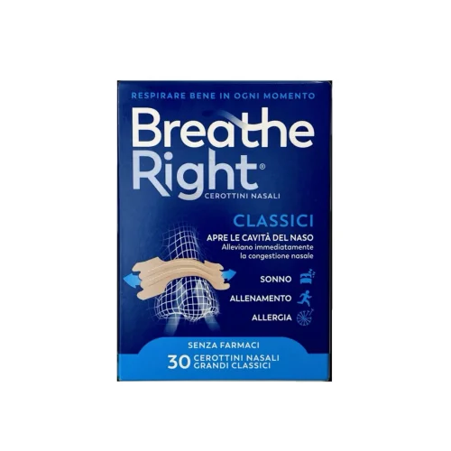 Breath Right RespiraBene è un dispositivo medico per adulti che aiuta a respirare meglio e a ridurre il russamento; i cerottini nasali Breath Right Respirabene allargano delicatamente i passaggi nasali, facilitando la respirazione in caso di congestione nasale, allergia o raffreddore.