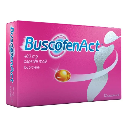 Buscofenact 12 Capsule 400mg - Analgesico e Antinfiammatorio Trattamento sintomatico di breve durata di: - dolore da lieve a moderato quale per esempio mal di testa, mal di denti e dolori mestruali; - febbre e dolore associati al comune raffreddore. BuscofenAct è indicato negli adulti e negli adolescenti con peso corporeo superiore a 40 kg (di età pari o superiore a 12 anni).