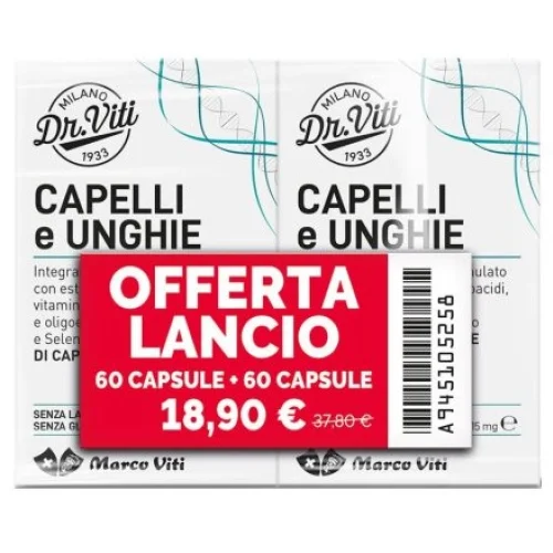 Dr. Viti Integratore CAPELLI&UNGHIE 60+60 Capsule è un integratore alimentare studiato per favorire la salute e la resistenza di capelli e unghie. Grazie alla sua composizione bilanciata, rappresenta un valido supporto nutrizionale nei periodi in cui queste strutture appaiono indebolite o crescono lentamente. Capelli e unghie riflettono spesso lo stato di salute generale dell’organismo. Carenze di aminoacidi, minerali o vitamine possono manifestarsi con capelli opachi, fragili o con eccessiva caduta e unghie sottili o che si sfaldano. Dr. Viti CAPELLI&UNGHIE fornisce un apporto mirato di nutrienti essenziali per sostenere la fisiologica crescita e il rinnovamento delle strutture cheratiniche.