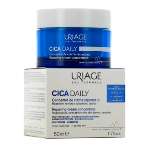 Uriage Cica Daily Crema Concentrata Riparatrice da 50 ml è un trattamento dermatologico studiato per rinforzare, riparare e proteggere la pelle ogni giorno. La sua texture avvolgente e nutriente fornisce un comfort immediato ed è particolarmente indicata per pelli fragili, stressate o sottoposte ad aggressioni esterne come inquinamento, sbalzi climatici o stress ossidativo.