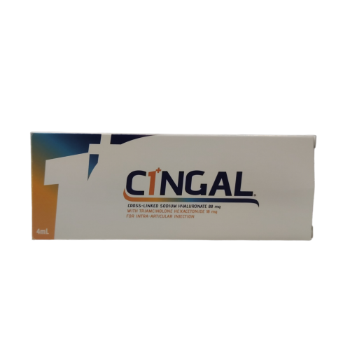 Cingal è una sospensione biancastra, opaca, sterile, monouso di un gel di acido ialuronico (HA) reticolato con aggiunta di un corticosteroide (triamcinolone esacetonide).