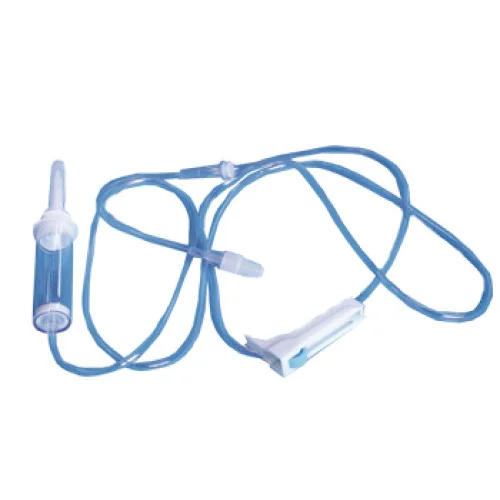 Con perforatore a due vie in ABS con cappuccio, tappino con filtro antibatterico idrorepellente, camera di gocciolamento con filtro soluzione 15 µm, tubi in PVC dalla lunghezza totale di 150 mm, stringi-tubo a roller, punto di iniezione a Y latex free posto a 20 cm dal raccordo d'innesto all'ago.