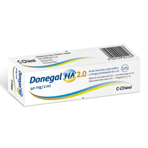 Dispositivo medico con marchio CE conforme alla direttiva MDD 93/42/CEE, contenente 20 mg/ml di acido ialuronico ottenuto per fermentazione e non modificato chimicamente. Donegal HA 2.0 è una soluzione trasparente, sterile, apirogena e viscoelastica fornita in una siringa da 2 ml. L'acido ialuronico è un polisaccaride naturale presente in molti tessuti umani, in particolare nel liquido sinoviale, ed agisce nelle articolazioni sia come lubrificante di cartilagini e legamenti sia come ammortizzatore. Secondo molti studi le iniezioni di acido ialuronico in articolazioni affette da osteoartrosi ripristinano la viscosità e l'elasticità del liquido sinoviale, con una conseguente attenuazione del dolore ed un miglioramento della mobilità dell'articolazione. Donegal HA 2.0 agisce solo a livello dell'articolazione in cui viene iniettato, senza esercitare nessuna azione sistemica.