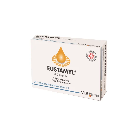 EccipientiEUSTAMYL 0,5 mg/ml collirio, soluzione (in confezione multidose): glicerolo; benzalconio cloruro; acqua per preparazioni iniettabili. EUSTAMYL 0,5 mg/ml collirio, soluzione (in confezione monodose): idrossietilcellulosa; sorbitolo; acqua per preparazioni iniettabili.