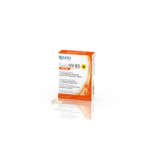 Integratore alimentare a base di fosfatidilserina, selenio, vitamina B5 e vitamina D3. Nasce dalla ricerca della Nutraceutica Fisiologica Guna, con componenti nutrizionali selezionati e mirati, utili in caso di aumentato fabbisogno o di diminuito apporto alimentare. I componenti sinergici di GunaVit B5 PLUS sono racchiusi in capsule di gelatina di origine vegetale. La vitamina B5 contribuisce a ridurre la stanchezza e l'affaticamento e a mantenere prestazioni mentali fisiologiche.