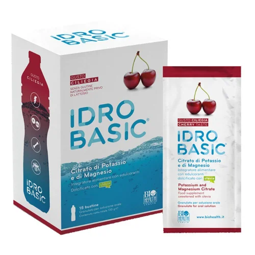 Integratore alimentare di minerali alcalinizzanti (citrati di potassio e magnesio), dolcificato con stevia. Ideale nel gestire e prevenire alcune patologie collegate alla disidratazione, e favorire una situazione di benessere derivante da un corretto equilibrio idrico dell'organismo. L'idropinoterapia è particolarmente importante in taluni soggetti sottoposti a forte disidratazione o ad aumentati fabbisogni: donne in gravidanza, atleti e sportivi in genere, bambini, anziani, pazienti affetti da calcoli renali, osteoporosi, dissenteria o in terapia con diuretici, lassativi e cortisonici. Idrobasic inoltre, apporta la giusta quantità di potassio e magnesio, al normale metabolismo energetico e alla normale funzione muscolare e ossea. Il tutto è stato realizzato utilizzando una miscela a bassissimo contenuto calorico (massimo 25 kcal per ogni bustina). Idrobasic ha una natura alcalina, infatti, essendo a base di citrato, è anche utile ad integrare una dieta povera di valenze alcaline (frutta e verdura) o compensare una dieta con elevato apporto di proteine o grassi che determinerebbero un eccessivo carico acido per l'organismo.