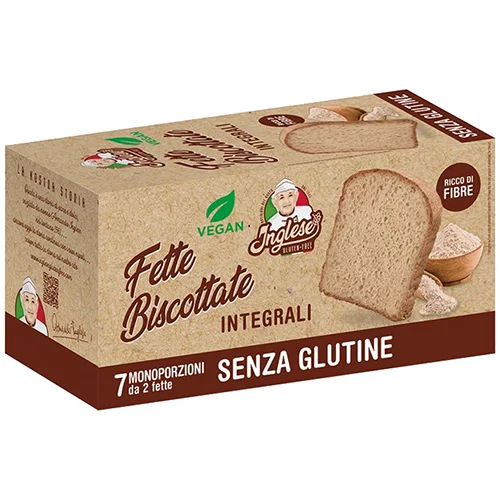 Fette biscottate integrali senza glutine e senza lattosio, preparate con ingredienti di alta qualità. Adatte a persone celiache, vegane e allergiche ai principali allergeni alimentari. A basso contenuto di grassi saturi e di zuccheri, confezionate in pratiche monoporzioni da due fette.