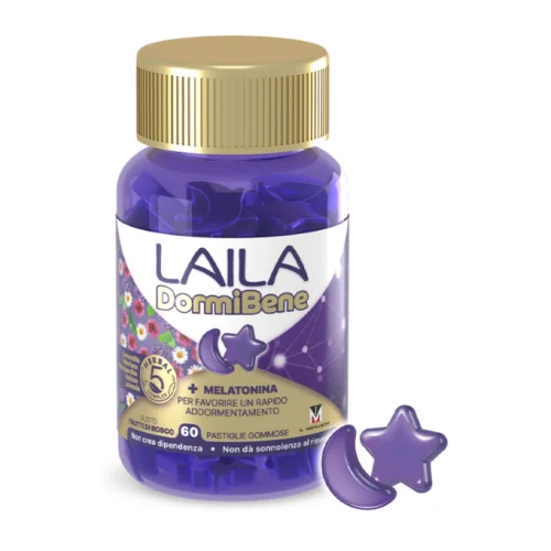 Le pastiglie gommose di Laila DormiBene, dal sapore fruttato di bosco, sono indicate per favorire un sonno di qualità. Questo integratore contiene una combinazione di cinque estratti botanici: Ashwagandha, Camomilla, Melissa, Lavanda e Valeriana, accoppiati alla Melatonina.
