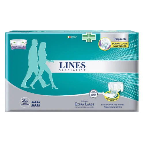 Il pannolone a mutandina Lines Specialist Alta Protezione misura Extra Grande è indicato per persone affette da incontinenza gravissima.