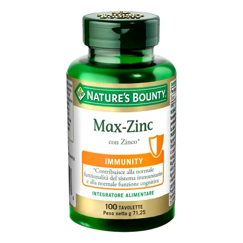Max-Zinc è un integratore alimentare a base di zinco. Lo zinco contribuisce alla normale funzionalità del sistema immunitario, alla protezione delle cellule dallo stress ossidativo e alla normale funzione cognitiva. Inoltre contribuisce al normale metabolismo dei macronutrienti, come carboidrati e acidi grassi, e alla normale sintesi delle proteine. Infine contribuisce alla normale fertilità e riproduzione e a conservare pelle, capelli e unghie normali.