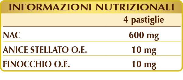 NAC (N-acetilcisteina), cellulosa microcristallina°, gomma arabica°, silicio biossido°°, anice stellato (Illicium verum) frutti O.E., finocchio (Foeniculum vulgare) frutti O.E., magnesio stearato di origine vegetale°°.
