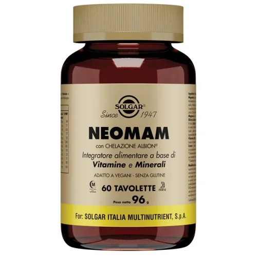 Integratore alimentare contenente ben 24 nutrienti tra vitamine e minerali opportunamente dosati secondo i VNR* specifici per la donna in gravidanza. NEOMAM può essere utilizzato anche durante l'allattamento a completamento di un'alimentazione che dev'essere comunque il più variata possibile. NEOMAM contiene tra gli altri nutrienti acido folico e iodio, nutrienti raccomandati dall'Organizzazione Mondiale della Sanità. In particolare, l'assunzione integrativa di acido folico aumenta lo stato del folato materno. Un basso stato del folato materno è un fattore di rischio per lo sviluppo di difetti del tubo neurale del feto. NEOMAM fornisce inoltre ferro bisglicinato, un minerale scelto in una forma biochimica brevettata, facilmente assimilabile e digeribile. La formula è arricchita con calcio, beta-carotene ed altri importanti elementi nutritivi come cromo, selenio spesso mancanti nelle formule prenatali.