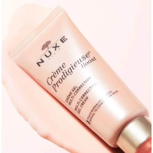 Applica Nuxe Crème Prodigieuse Boost Crema Gel Multi-Correzione 40 ml la mattina e/o la sera.