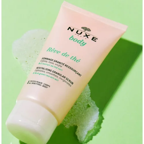 Applicare Nuxe Rêve de Thé Esfoliante Granulare Rigenerante Corpo 150 ml una o due volte la settimana.