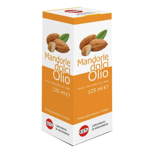 Olio di mandorle dolci [Prunus dulcis (Mill.) D.A. Webb, syn. Prunus amygdalus Batsch.] della Fam. Rosaceae. L'olio di mandorle dolci è uno degli oli con la più alta percentuale di acidi grassi insaturi e polinsaturi. Il processo di spremitura a freddo garantisce la conservazione delle proprietà naturali dell'olio. Ha azione emolliente e lenitiva (sistema digerente) e favorisce la regolarità del transito intestinale.