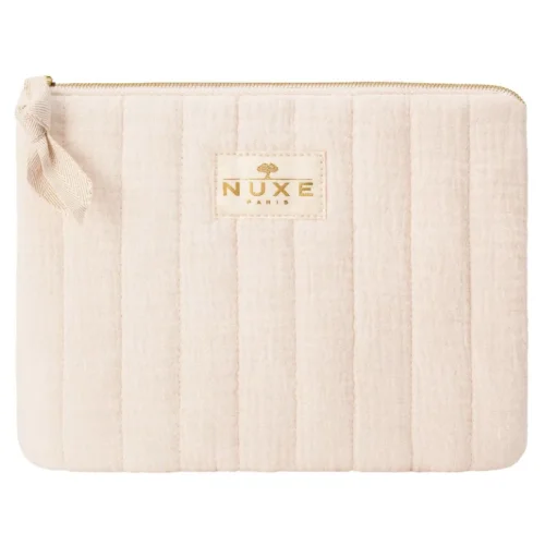 Pochette Nuxe di colore bianco* con chiusura color oro. Ideale Beautycase per la tua routine di bellezza Nuxe.