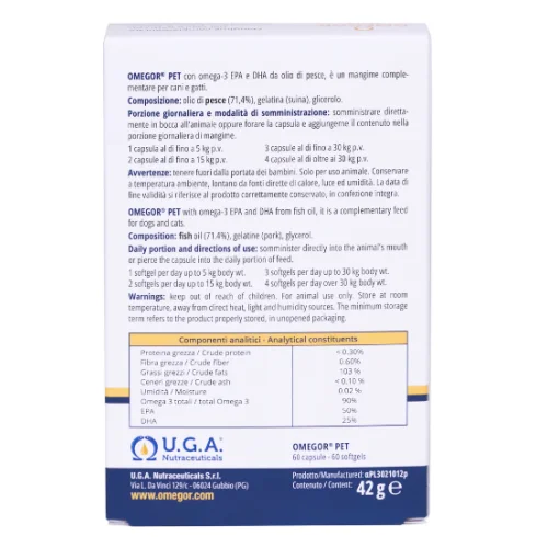 Ogni confezione di Omegor Pet include 60 capsule molli, assicurando un trattamento adeguato per periodi prolungati. La data di scadenza indicata si riferisce al prodotto correttamente conservato, in confezione originale non aperta.