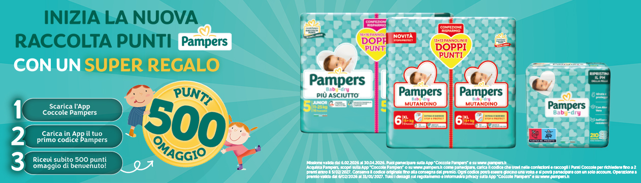 Fai i tuoi acquisti scegliendo i tuo prodotti Pampers preferiti, scarica l'App Coccole Pampers e carica il tuo codice per ottenere i punti di Benvenuto!