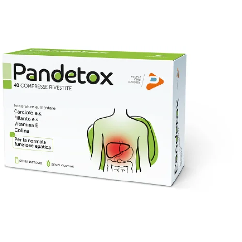 Contiene estratti secchi titolati di Cynara scolimus, Phyllantus niruri, vitamina E e colina. Pandetox compresse rivestite favorisce la funzione epatica grazie agli estratti titolati di Phyllantus niruri, Cynara scolymus e alla colina. L'estratto di Cynara scolimus inoltre è utile per favorire la funzione digestiva, le funzioni depurative dell'organismo e l'eliminazione dei gas intestinali.