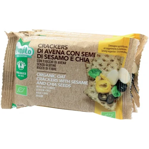 Crackers con fiocchi di avena , semi di sesamo e chia in una pratica confezione di 4 pacchettini monodose perfetti per essere gustati ovunque nei momenti di pausa o come sostituti del pane durante il pasto. Prodotto vegan.