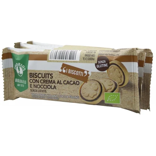 Biscotti biologici e senza lievito, con crema al cacao e nocciola , senza glutine, farciti con una morbida crema al cacao e nocciola.