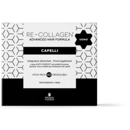 Re-Collagen capelli uomo è un integratore alimentare con aminoacidi, vitamine ed estratti vegetali come equiseto, zinco e biotina, che contribuiscono al mantenimento di capelli normali e con rame per la normale pigmentazione dei capelli.