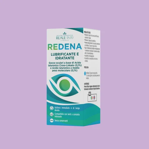 REDENA è un Dispositivo Medico ad uso oftalmico costituito da una soluzione leggermente iposmolare, a bassa viscosità, sterile, a pH fisiologico, priva di conservanti, comprendente una combinazione di acido ialuronico cross-linkato ed acido ialuronico lineare a medio peso molecolare, in confezione polidose da 10 ml, ad elevata biocompatibilità. L’acido ialuronico cross-linkato si presenta con struttura molecolare reticolata che in combinazione con l’acido ialuronico lineare a medio peso molecolare, conferisce una maggiore idratazione, permanenza ed attività lubrificante sulla superficie oculare, tale da alleviare i sintomi associati alla sindrome dell’occhio secco.