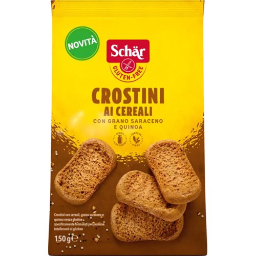 Crostini ai cereali preparati con grano saraceno e quinoa, fonte di fibre senza glutine, senza frumento, senza lattosio, senza olio di palma e senza conservanti.