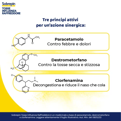 Il Sobrepin Tosse Influenza Raffreddore rappresenta un medicinale innovativo con tre ingredienti attivi sinergici. Il paracetamolo riduce la febbre e allevia il dolore, il destrometorfano agisce sulla tosse, mentre la clorfenamina offre sollievo dalla congestione nasale.