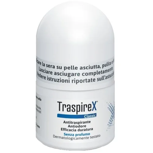 Prima dell'applicazione, assicurarsi che la zona ascellare sia asciutta, priva di tagli o abrasioni. Passare il roll-on delicatamente un'unica volta. Applicare la sera prima di andare a dormire. Fare asciugare bene prima di indossare l'abbigliamento da notte per evitare eventuali aloni sul tessuto. Traspirex non ha odore.